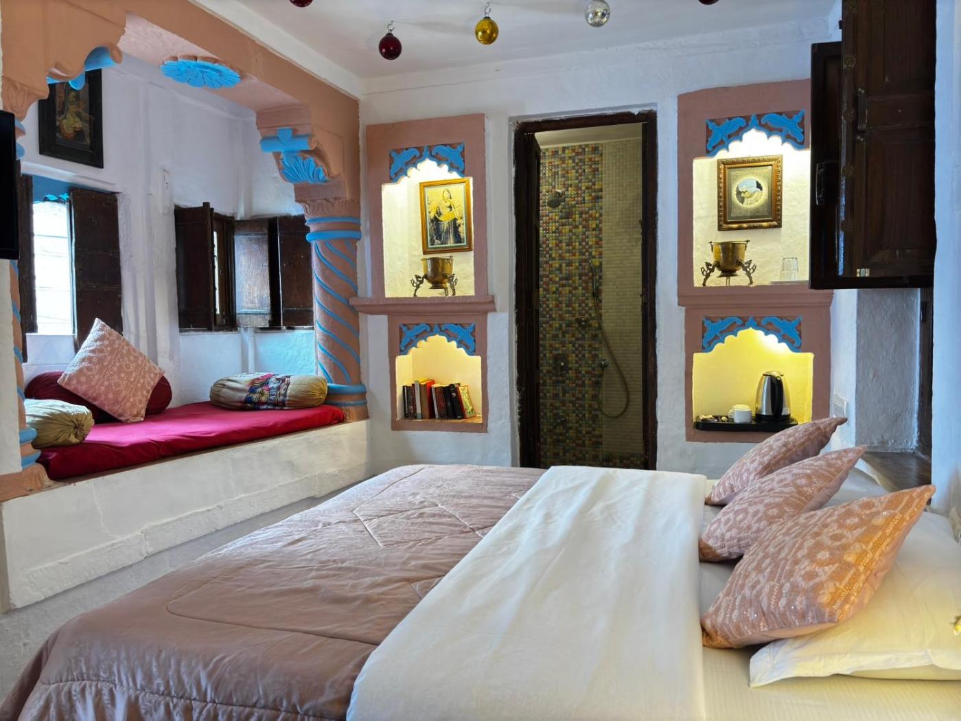 Heritage Suite. A spacious suite designed to reflect the timeless charm of Rajasthan. The room features mosaic-tiled flooring, carefully selected antique furniture, and traditional textiles thatan authentic heritage ambience. Guests enjoy air-conditioning, a comfortable seating area, and an attached bathroom with 24-hour hot and cold water and shower facilities. ;