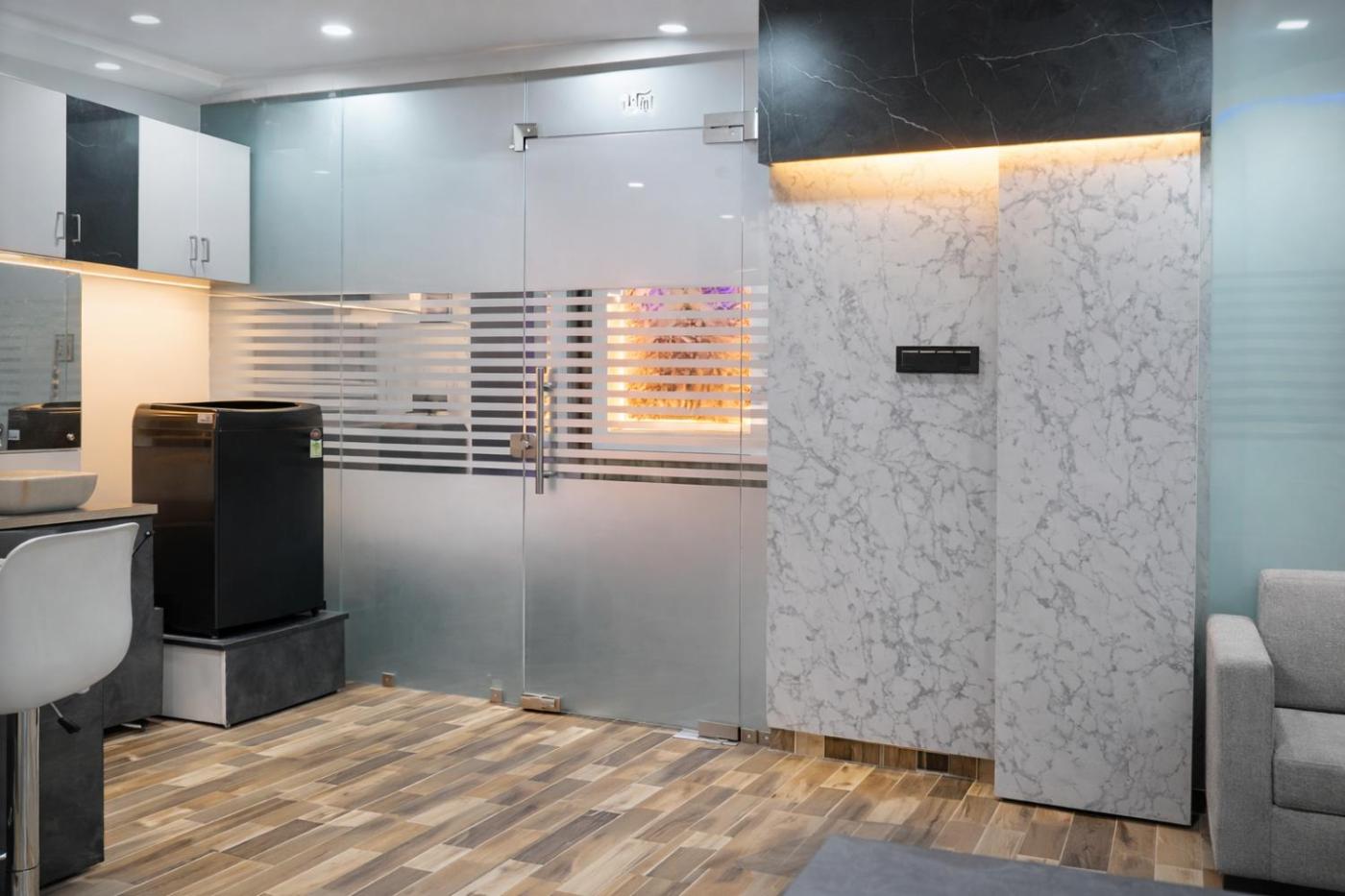Two-Bedroom Apartment with City View. This spacious apartment features 1 living room, 2 separate bedrooms and 2 bathrooms with a walk-in shower and free toiletries. Meals can be prepared in the kitchen, which has a stovetop, a refrigerator, kitchenware and an oven. The air-conditioned apartment features a flat-screen TV with streaming services, a washing machine, soundproof walls, a minibar as well as garden views. The unit has 4 beds and 1 futon.